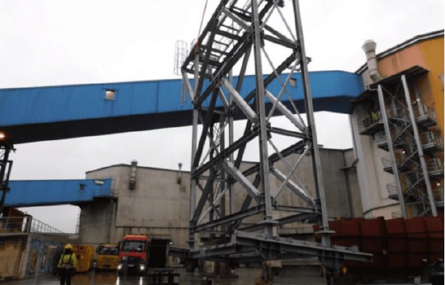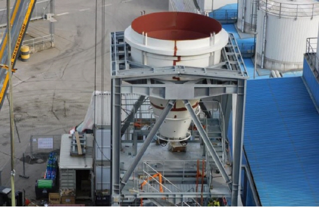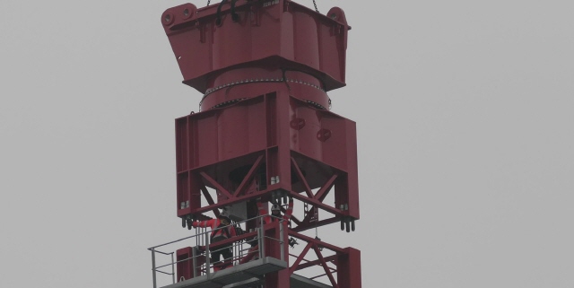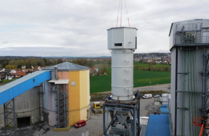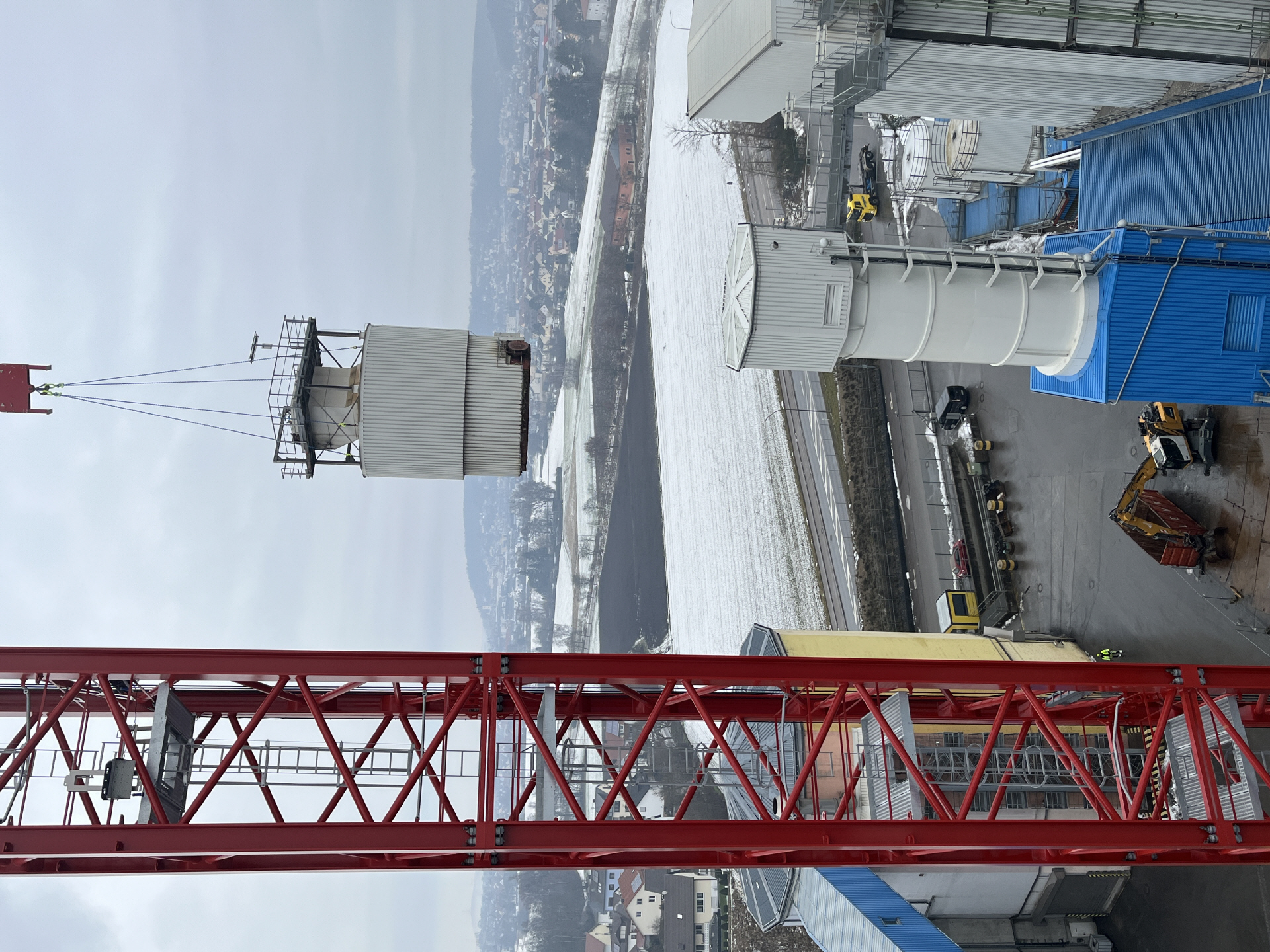 4. April 2024 Anfang April wurde der „Kopf“ des Frischkalksilos erfolgreich montiert. Der obere Abschluss des Silos wiegt 18 Tonnen und ähnelt einem Wasserturm. |
