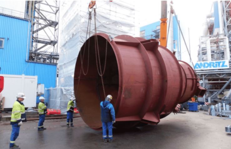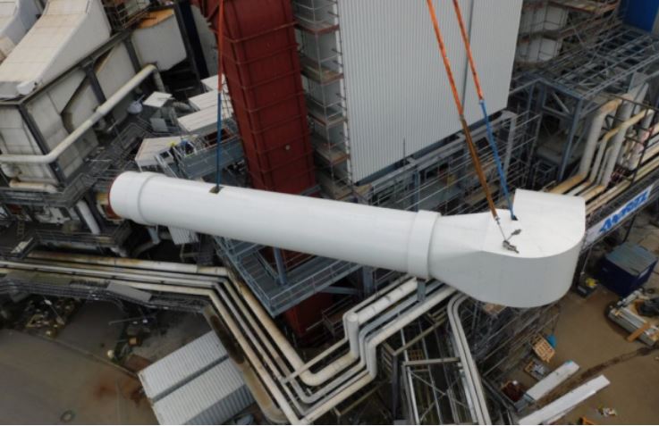15. März 2024 Am darauffolgenden Tag stellte das Team die Verbindung zum Rauchgaskanal her. Mit einem Gewicht von 10 Tonnen ist sie sehr bedeutend für die effektive Ableitung der gereinigten Gase. |