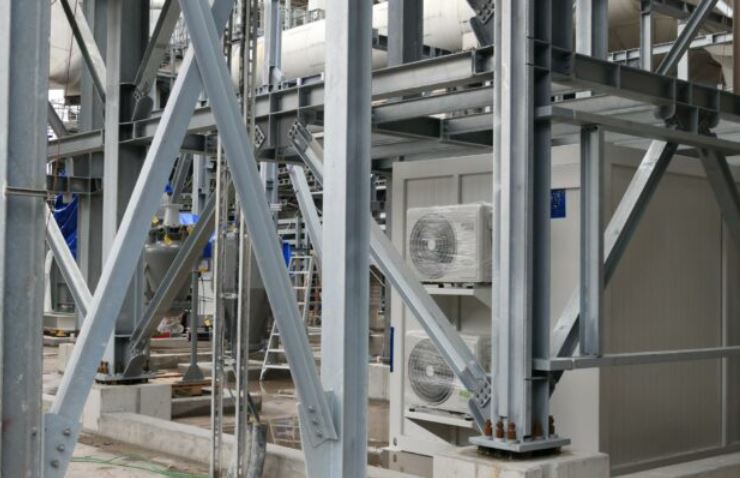 14. März 2024 Das Bauteam installierte das Dach der Gewebefilterkammern und die Verbindung zum Rausgaskanal. |
