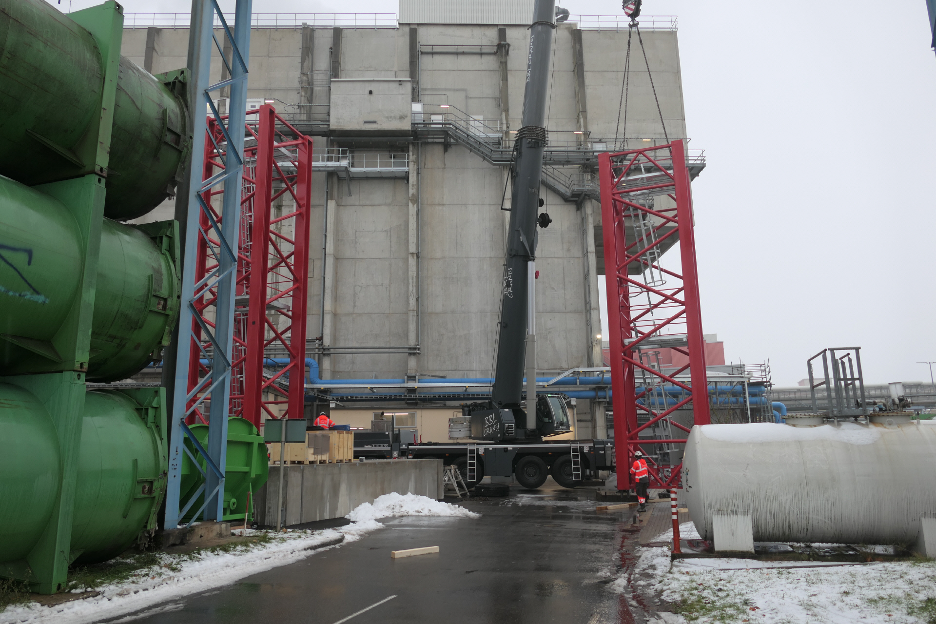 31. Januar 2024 Ende Januar erfolgte auf der Baustelle ein bedeutender Fortschritt: Die Installation von sechs Gewebefilterkammern (GFK) mit je 21 Tonnen Gewicht. Davor mussten die Bauteile gedreht werden, um sie für den Einbau vorzubereiten. |