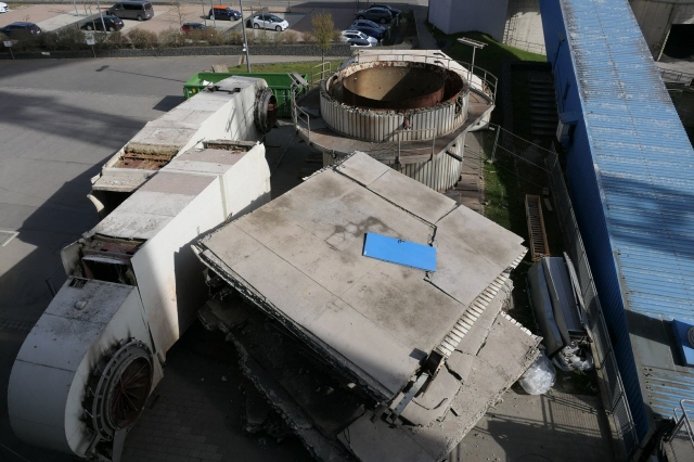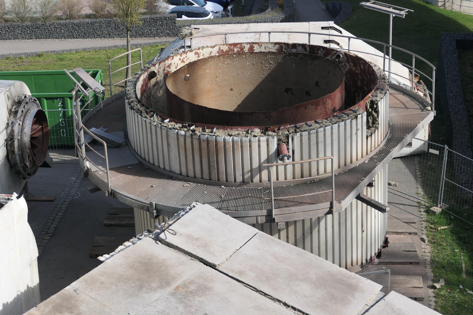 09.04.2026 Eintweilen zwischengeparkt waten Saugzugkanäle und ein größeres Reaktorteil auf ihre Zerkleinerung. |