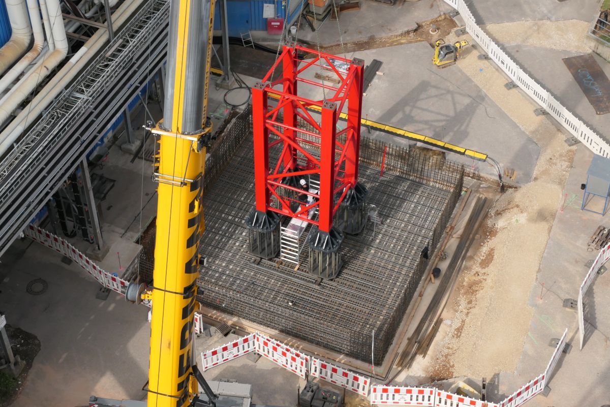 Derartige „Großbaukräne“ können nicht einfach auf einer Asphaltfläche abgestellt werden. Sie benötigen massive, statisch exakt berechnete Betonfundamente von ca. 180 bzw. 260 Kubikmetern, in denen die entsprechenden Befestigungsanker fest vergossen sind.